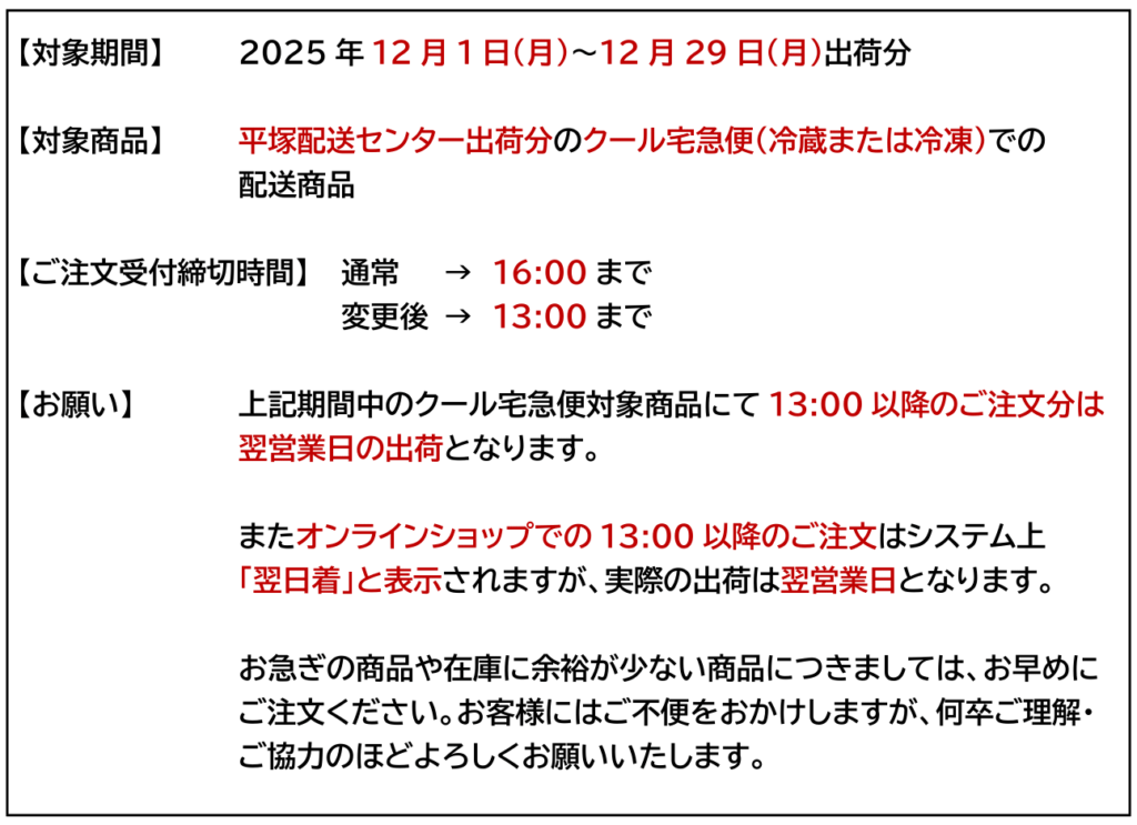 さて、このたびヤマト運輸より、2025年12月の1カ月間に限り、平塚配送センター出荷分のクール宅急便の集荷時間を早めるとの通達がございました。